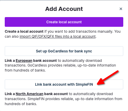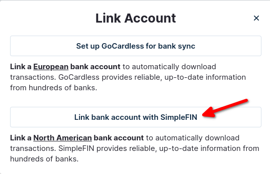 Next to "Link bank account with SimpleFIN", click the three-dot menu button.