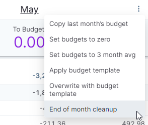• Place the #cleanup source text in the utility bill categories. When clicking the End of month cleanup button, the extra money will be returned to To Budget to use for covering the overspent categories. The money will remain in To Budget until you decide where it should go.