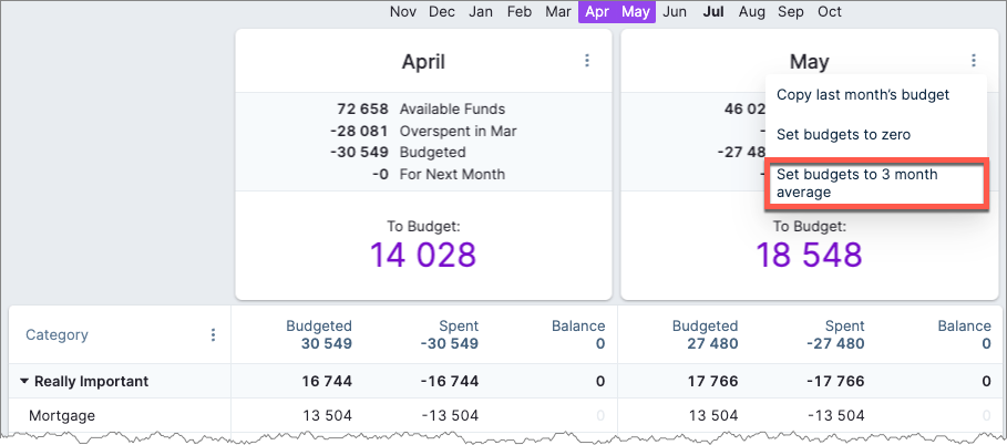 You have two easy ways to populate the various budget values when this is done. You can apply the last three months' average on all budget categories: